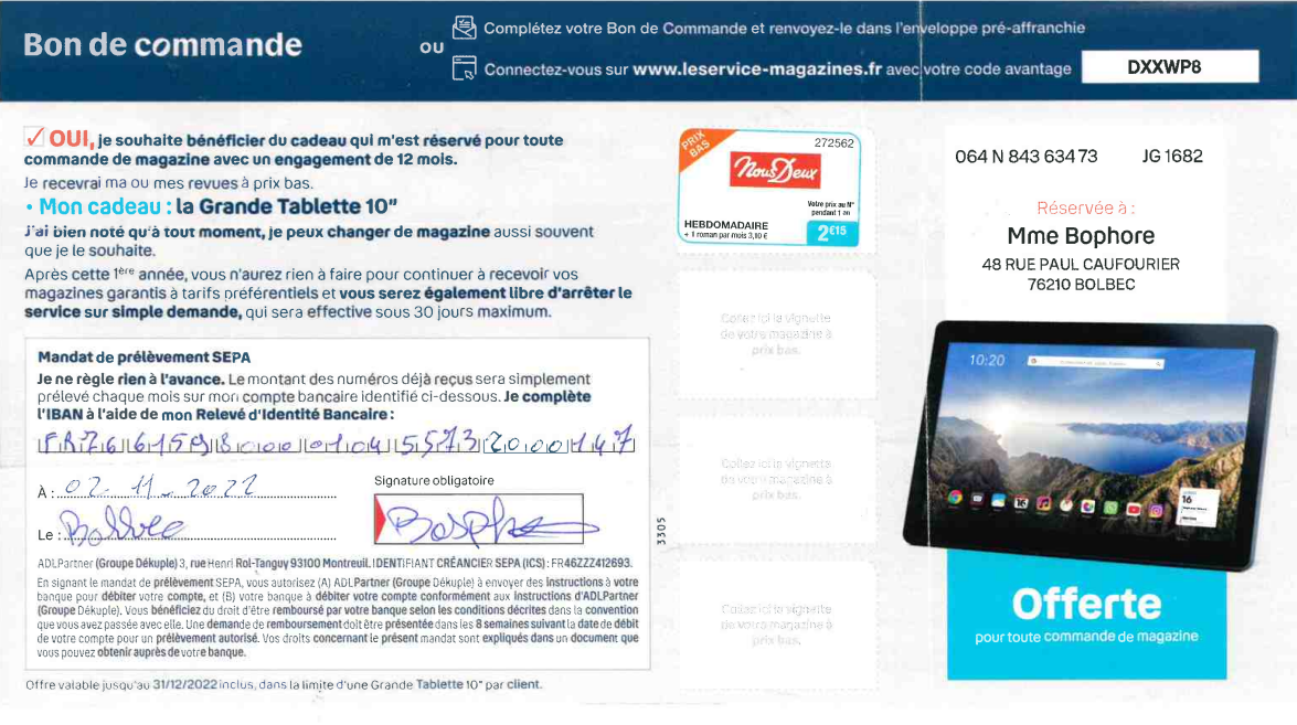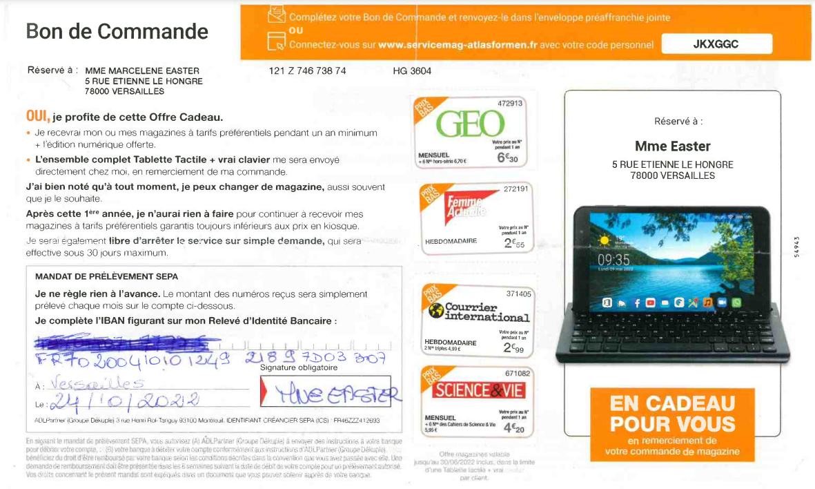 Des propositions de commandes sont envoyées aux clients partenaire d’une enseigne ou une banque avec prélèvement sur leur compte (pas de paiement par chèque, espèce, mandat).