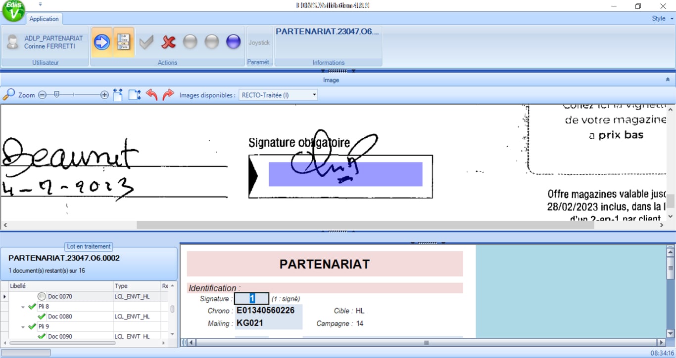 Signature si présence il faut saisir 1 si absente il faut rejeter le document via F3 motif « rejet » et cliquer sur le bouton « rejeter »