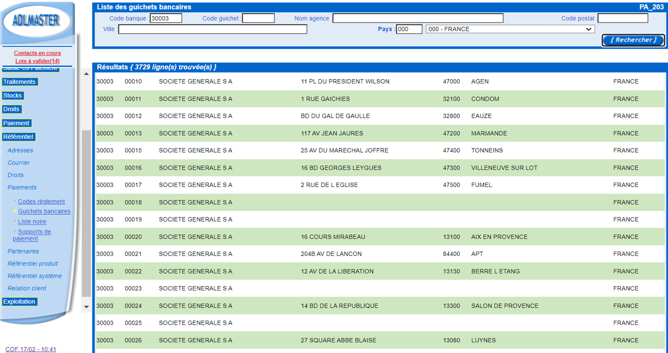Sur ADLMASTER Menu Référentiel – Paiement – Guichet Bancaire :